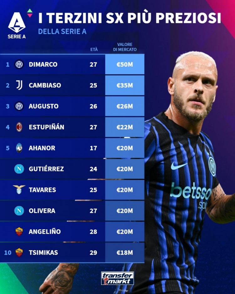 直播吧10月13日讯 德国转会市场盘点了意甲联赛左后卫身价,迪马尔科5000万欧元居首。